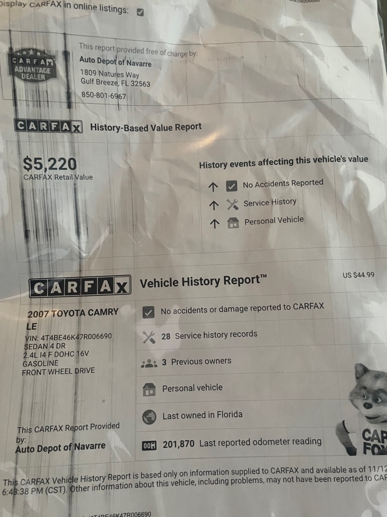 Vehicle Inquiry for 2007 Toyota Camry CE 5-Spd AT